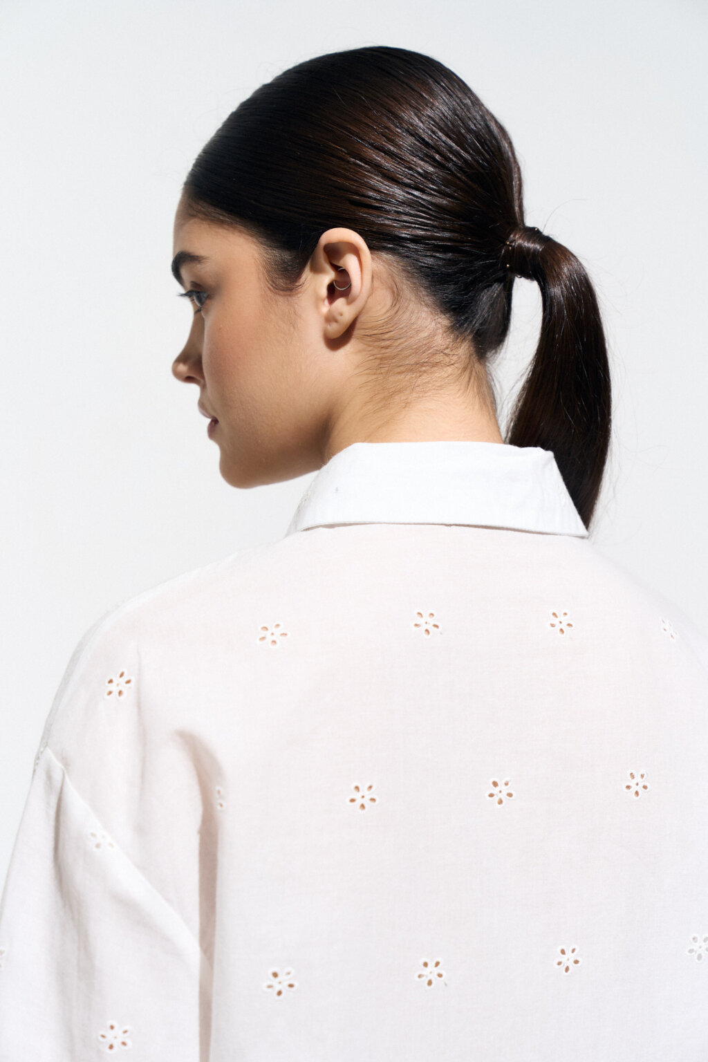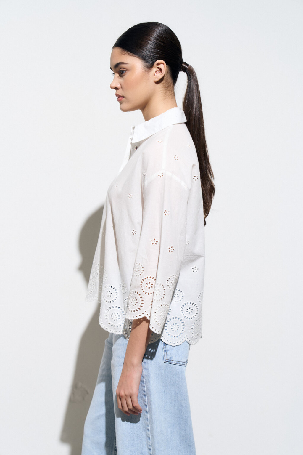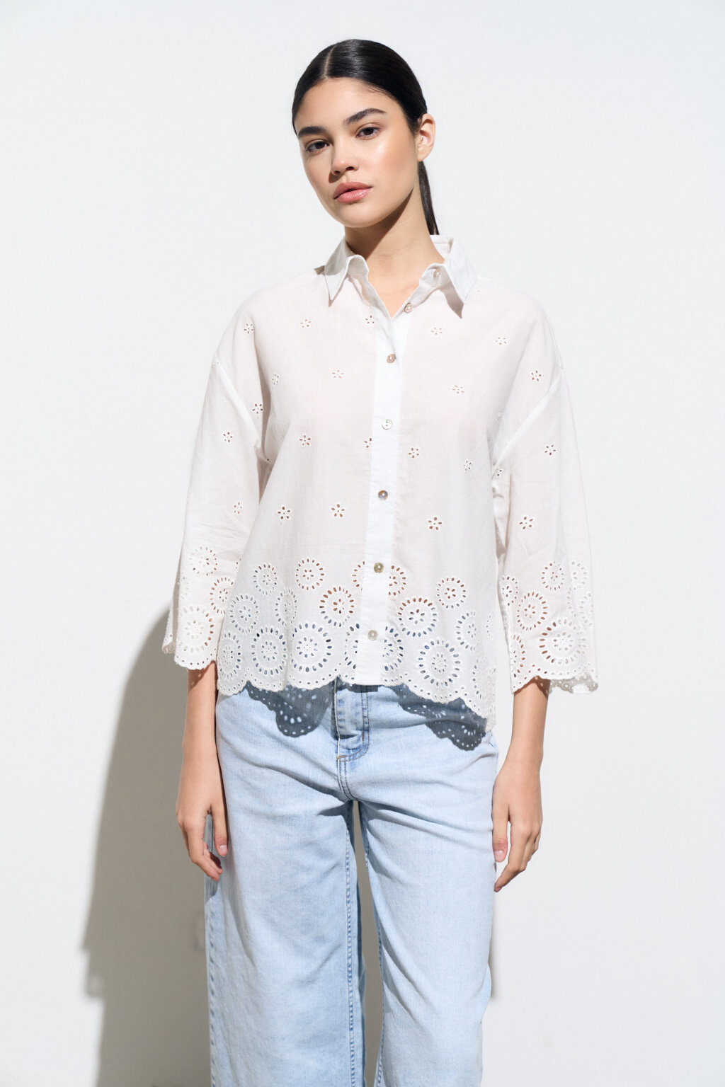 Camisa manga acampanada 3/4 con embroidery calado en ruedo.