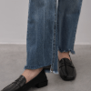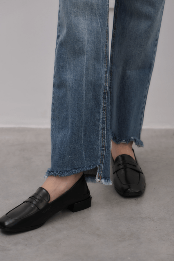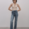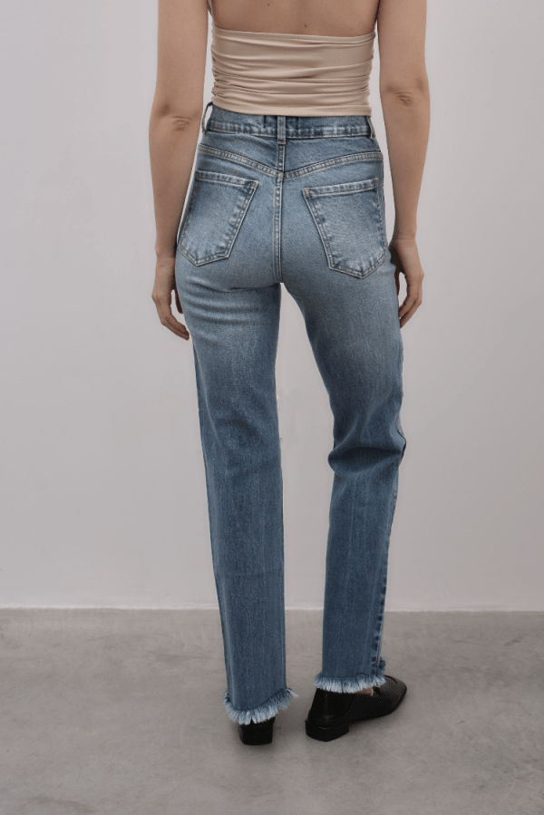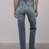 CROPPED BLUE Jean elastizado calce recto cropped, tiro alto. Es color azul vintage con bigotes y localizado. Tiene el ruedo desflecado con forma irregular. Las costuras son color camel y los avíos níquel viejo.