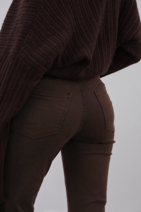 OXFORD COLORS ONI BROWN Jean elastizado calce oxford, tiro alto. Es color chocolate, tiene las costuras a tono, los avíos cobre florentino y el ruedo clásico.