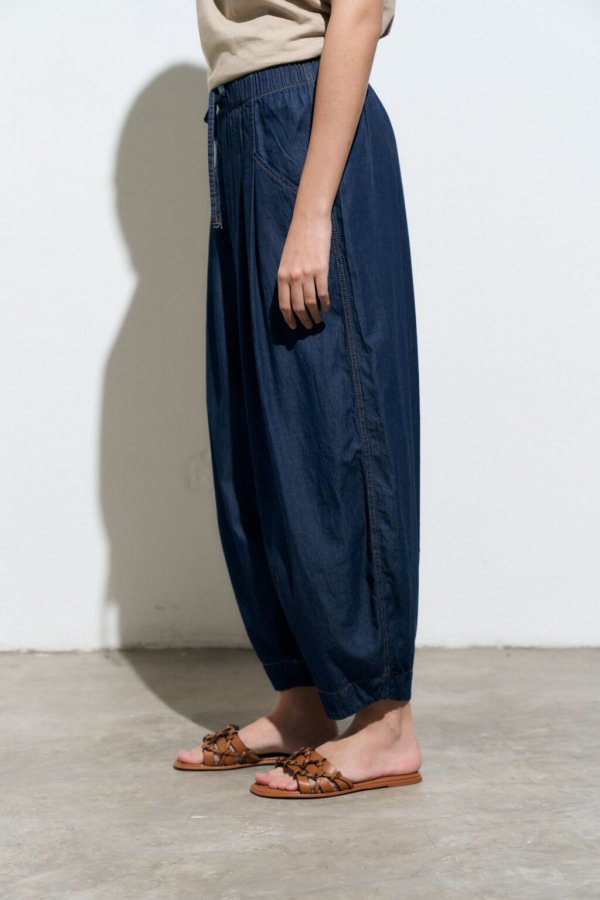 Jean baggy de denim camisero, cintura elastizada con lazos atracados, con pinzas y bolsillo en delantero