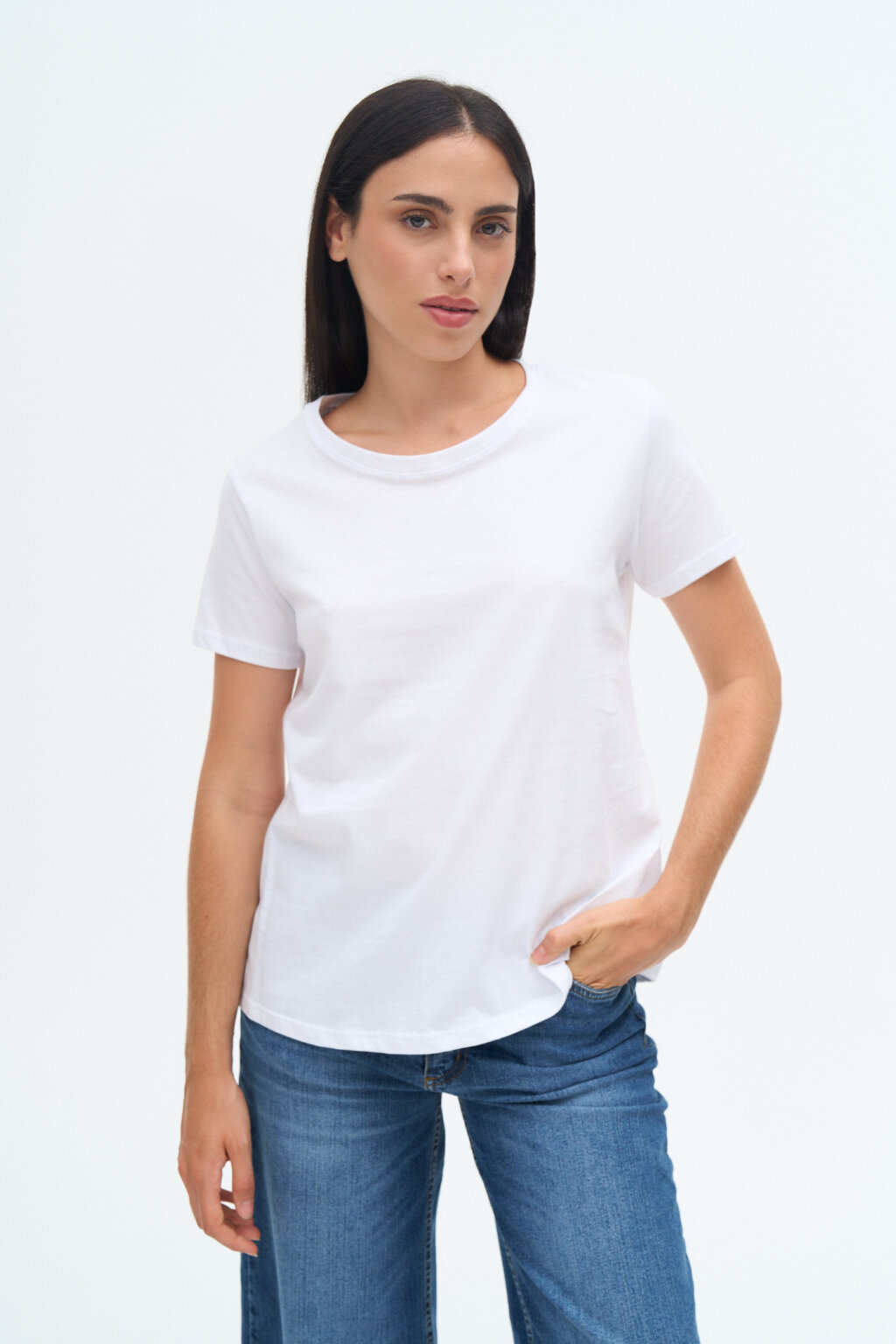 Remera básica de algodón oversize con manga corta y ruedo irregular en espalda.