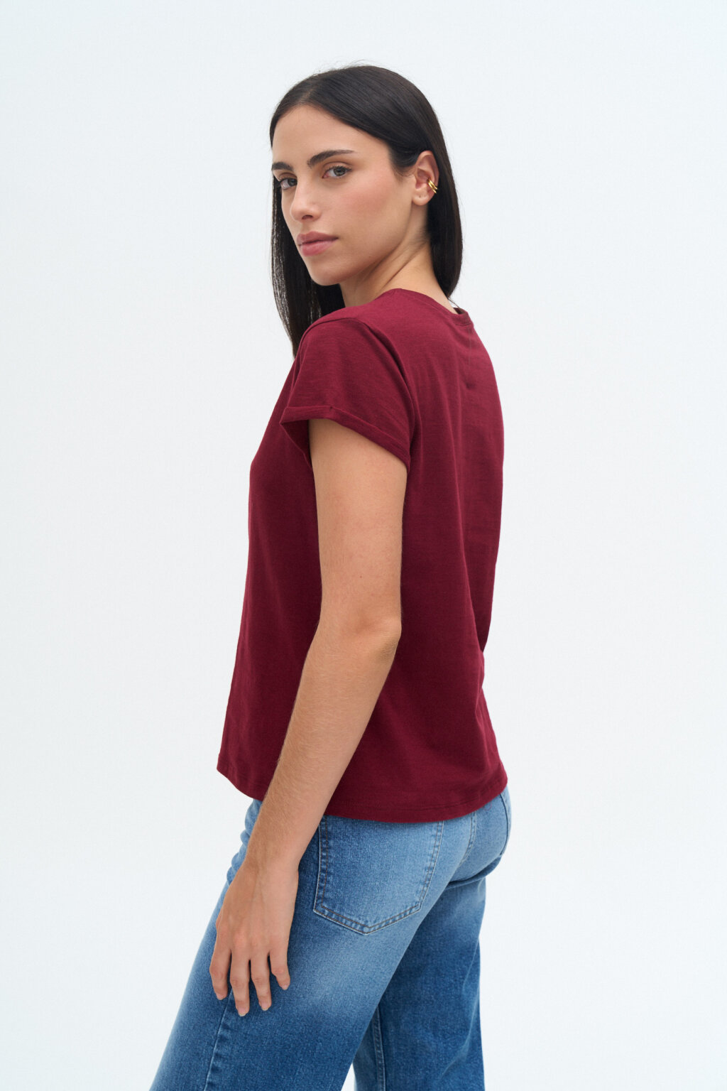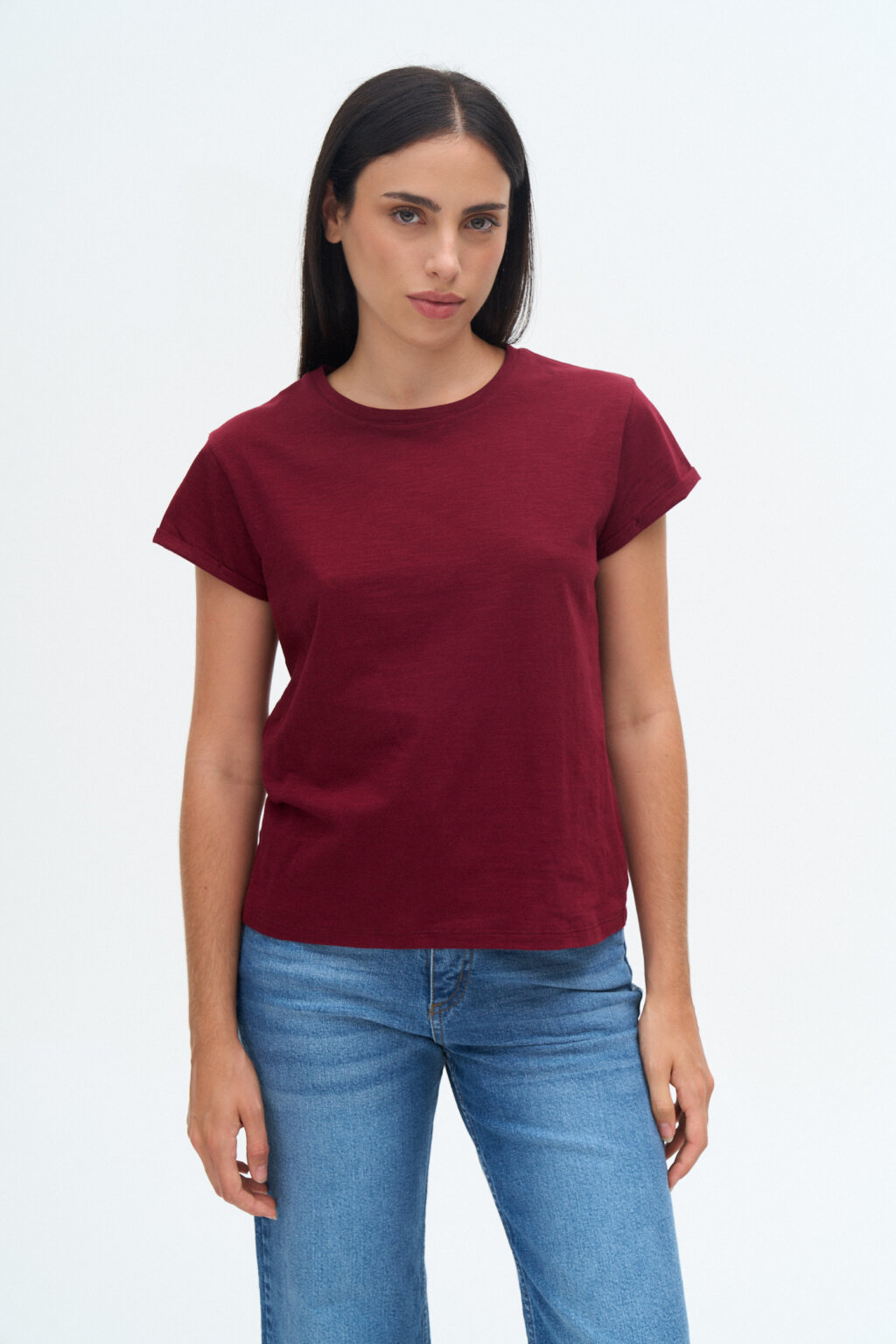 Remera manga corta con escote redondo de jersey flamé, con dobladillo en la manga.