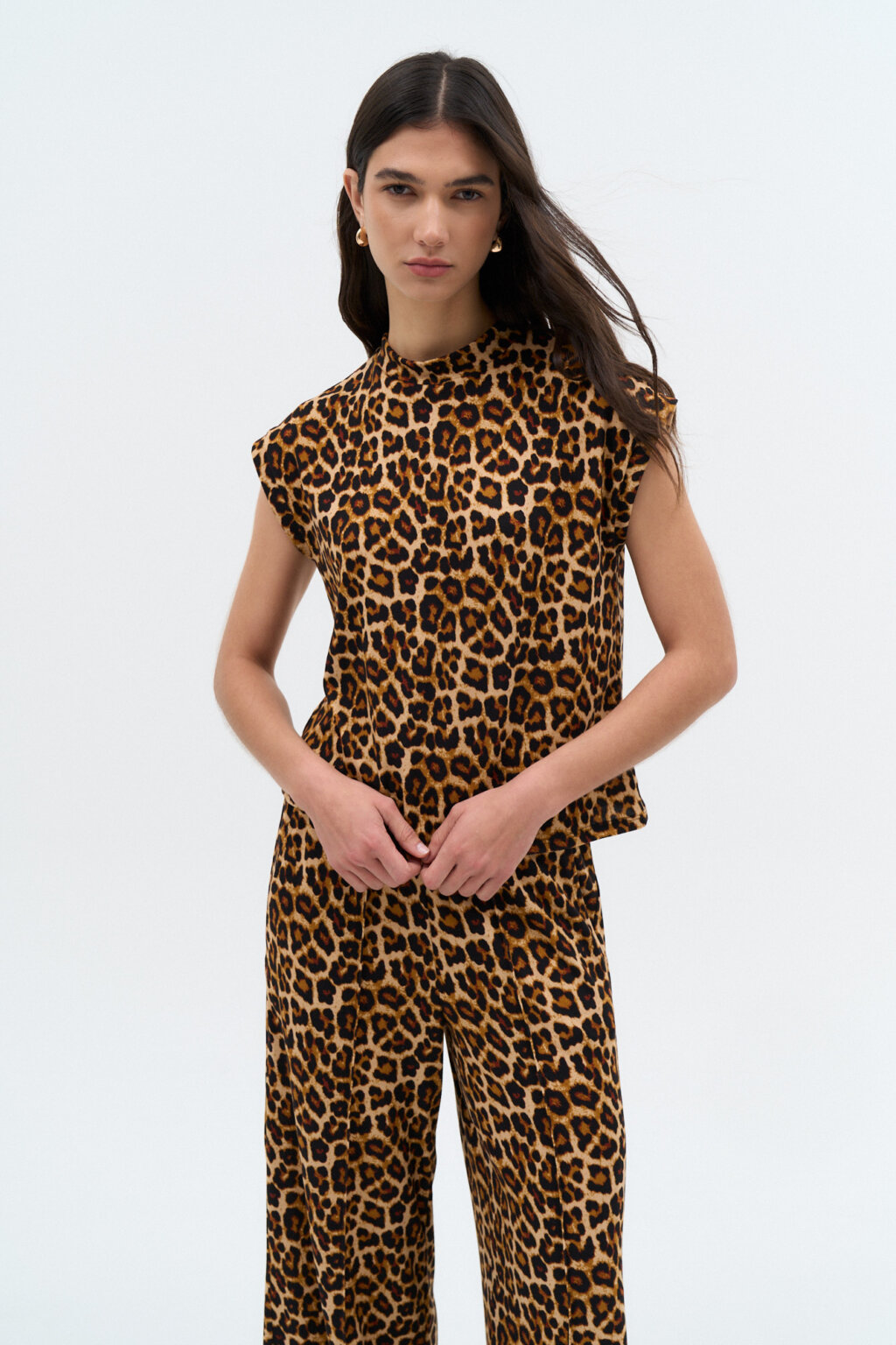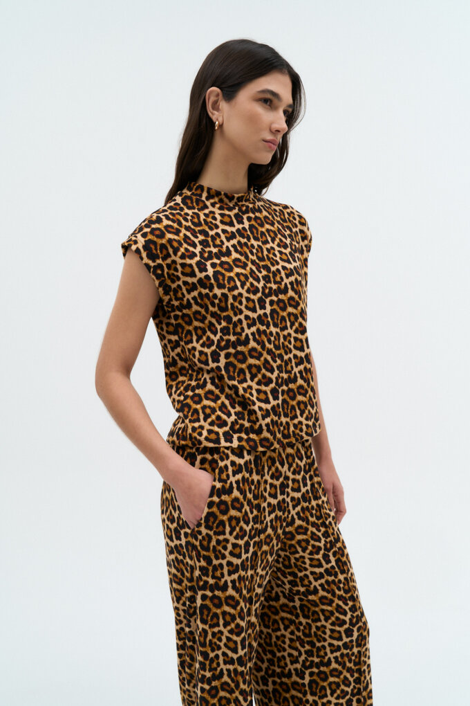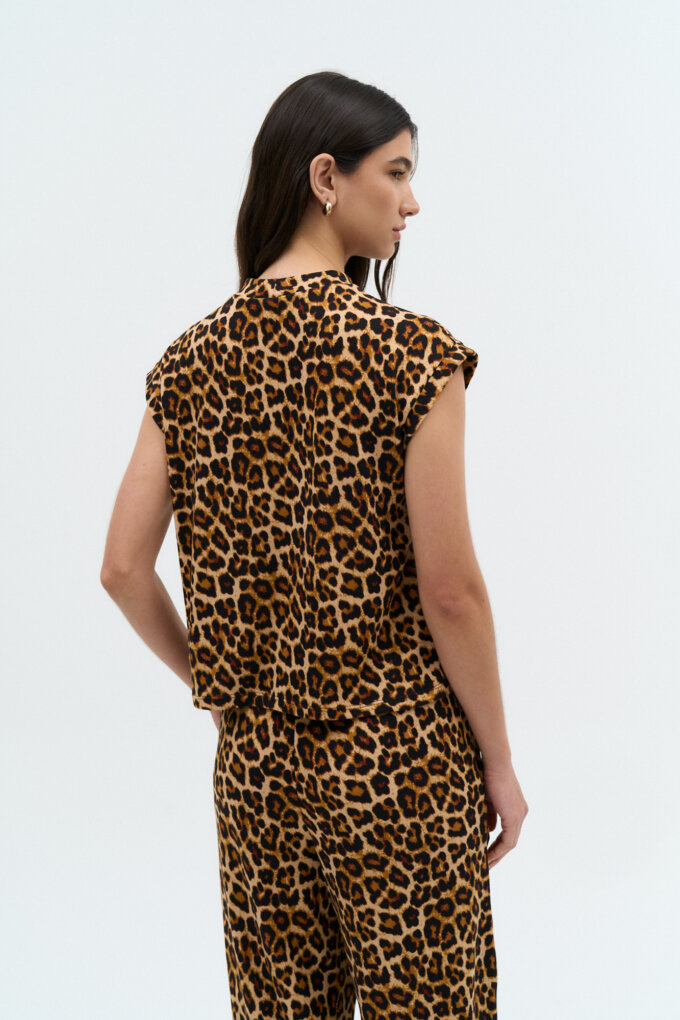 Remera en lanilla animal print leopardo, caja amplia sin mangas con escote alto.
