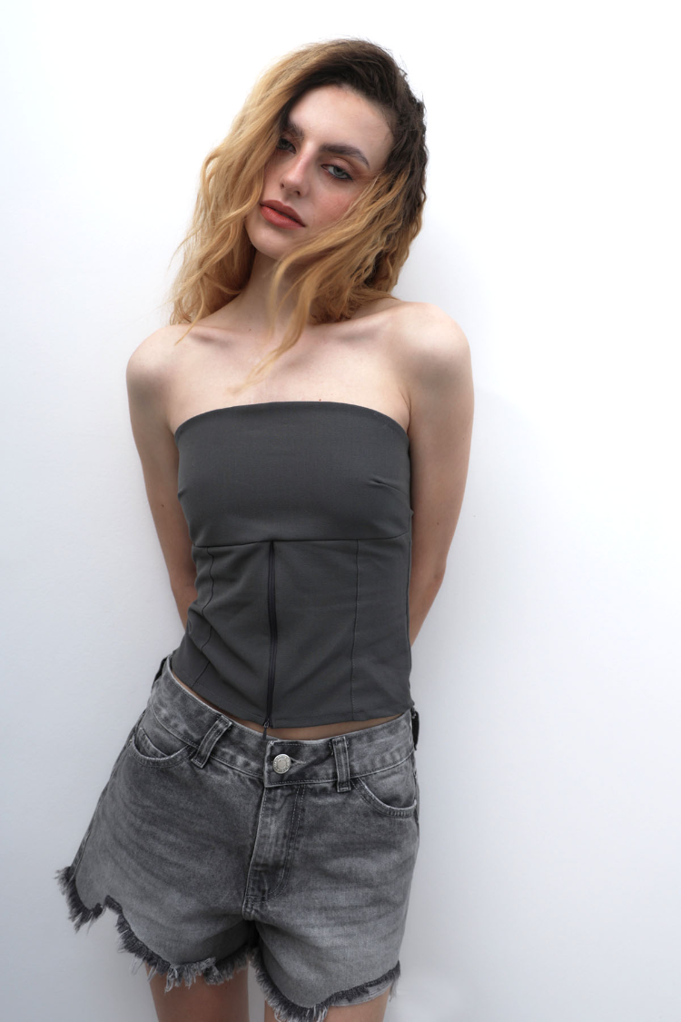 Short de jean rígido color gris, tiro medio. Tiene bigotes en el frente y ruedo desflecado con roturas en terminación. Las costuras son en tono gris y los avíos que lleva son níquel opaco.