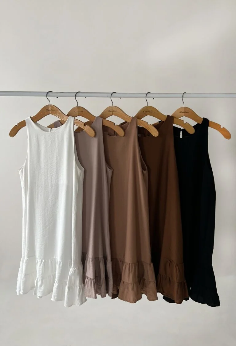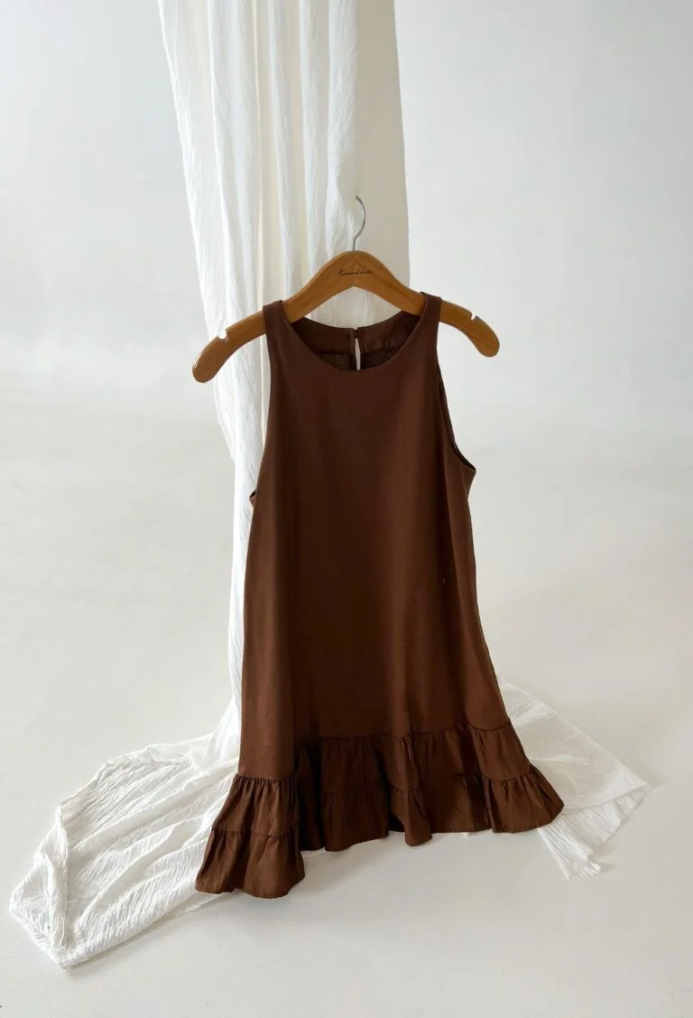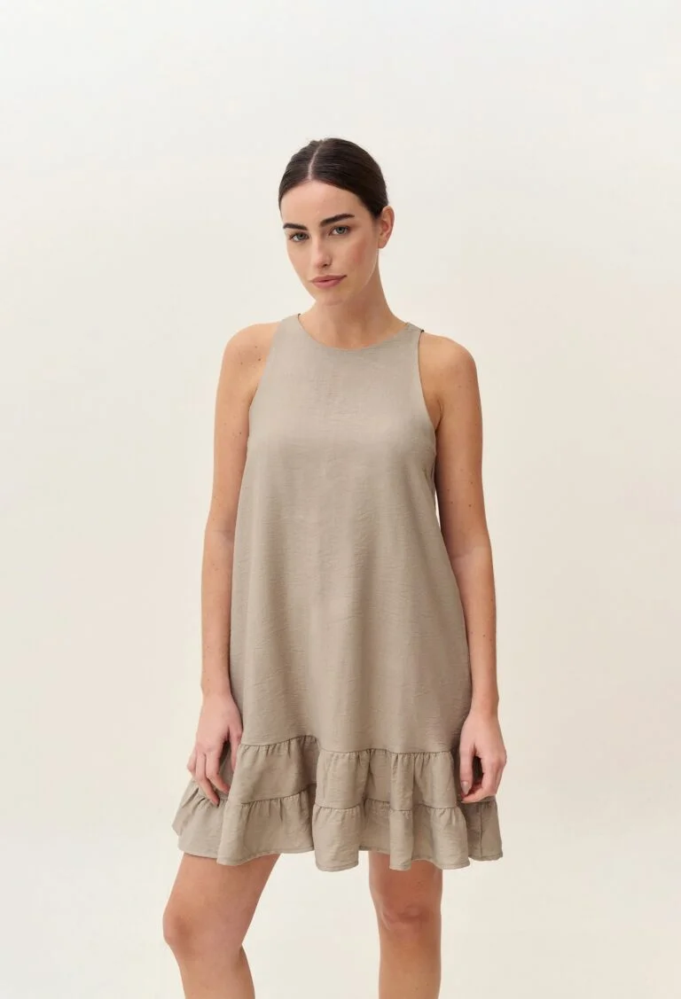 VESTIDO DE SIMIL LINO CON DOBLE VOLADOS Y GOTA EN LA ESPALDA.